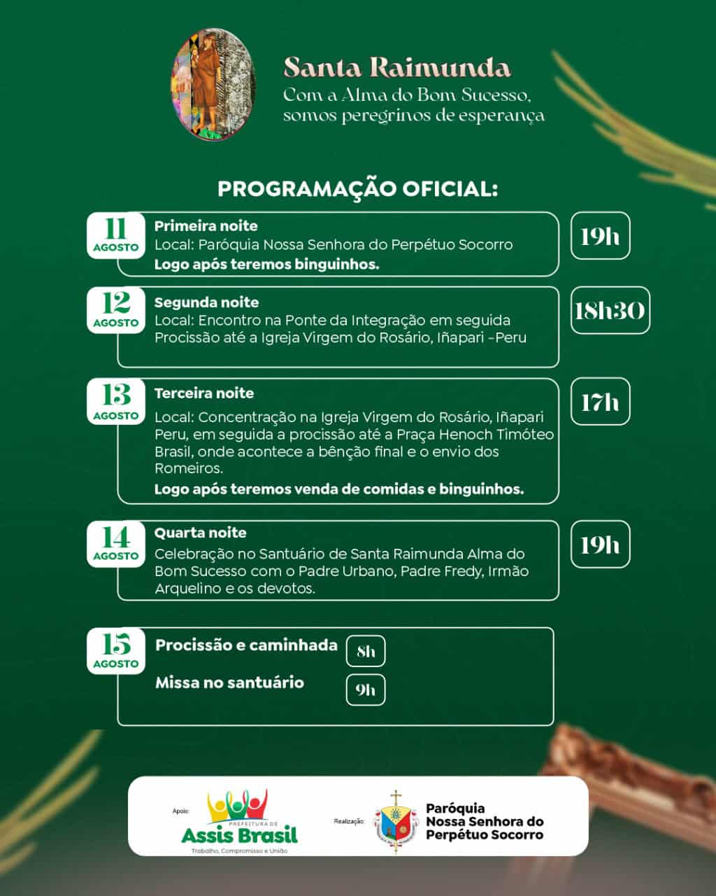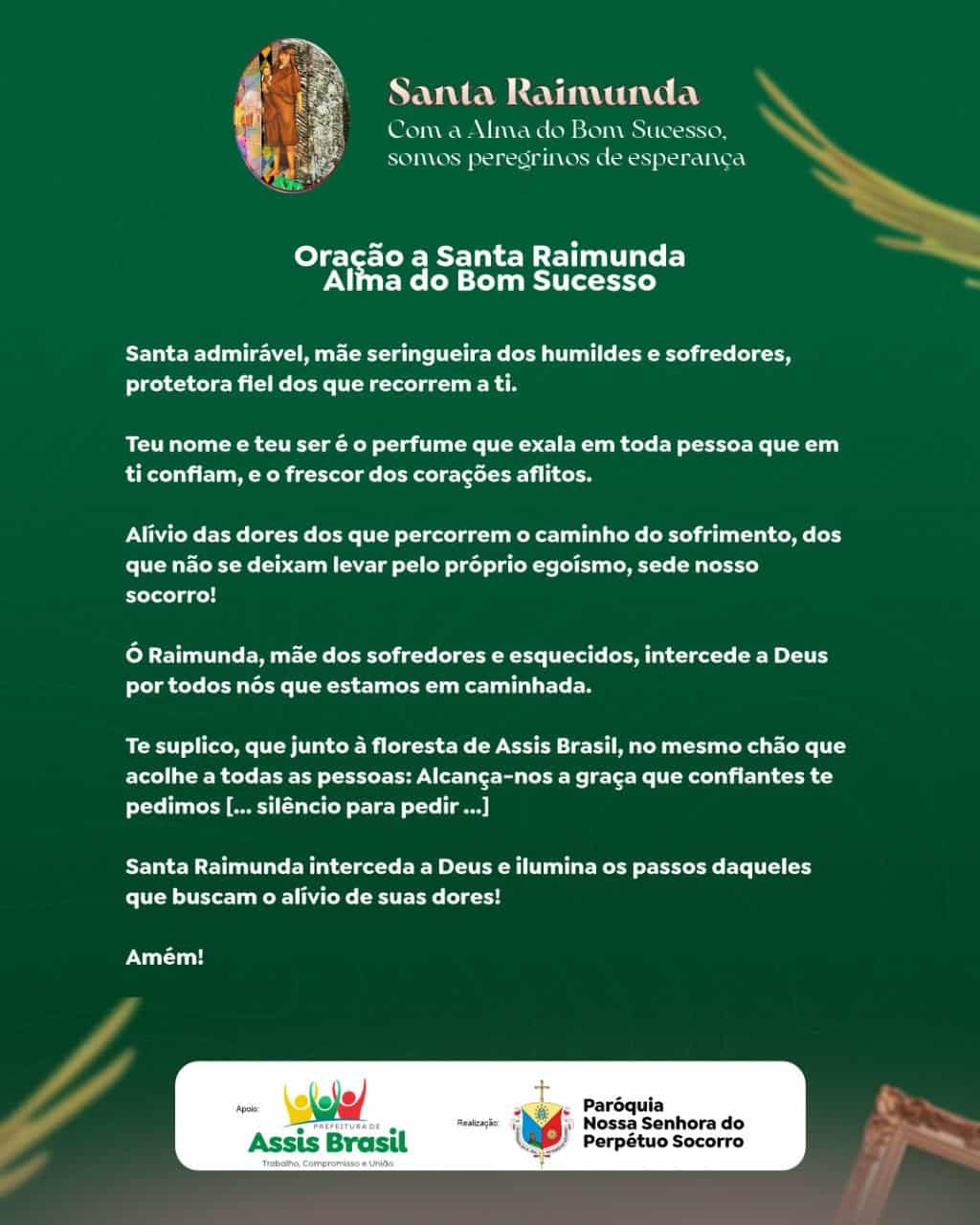 Uma das manifestações de fé mais tradicionais e conhecidas da região do Alto Acre, especialmente na tríplice fronteira Brasil, Peru e Bolívia, é a romaria em devoção à Santa Raimunda do Bom Sucesso. O evento acontece na próxima sexta-feira, 15, no município de Assis Brasil, e deve reunir milhares de fiéis.