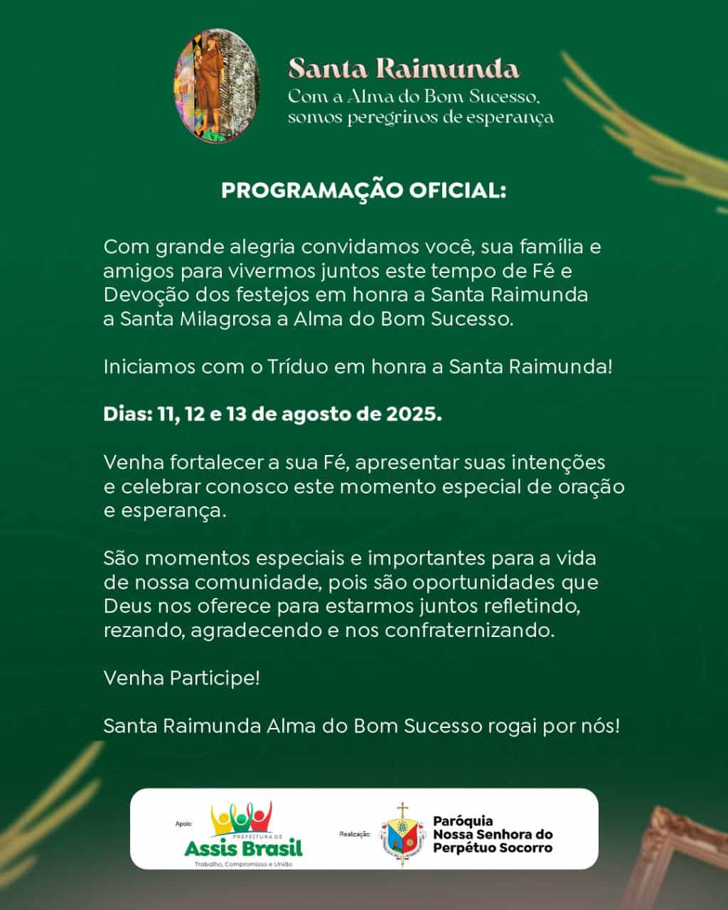 A expectativa é de que, neste ano, a celebração reúna um número ainda maior de peregrinos. A Prefeitura de Assis Brasil, juntamente com a paróquia local, está preparando toda a logística para garantir segurança e apoio aos romeiros.