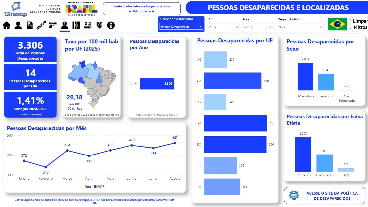 O Estado de Rondônia ocupa a segunda posição na Região Norte como um dos Estados com o maior número de pessoas desaparecidas, entre janeiro e agosto de 2025. Os dados são do Ministério da Justiça e Segurança Pública. Nesse período, o primeiro lugar ficou com o Estado do Pará (700 pessoas); seguido por Rondônia (696) e Amazonas (640).