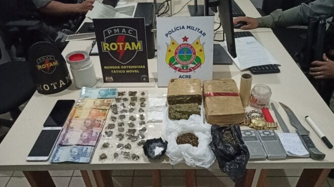 Uma ação dos Policiais Militares da ROTAM, do Batalhão de Operações Especiais (BOPE), resultou nas prisões de Marcelo Nascimento da Cruz, de 31 anos e do foragido Onassis de Souza Feitosa, de 28 anos, na noite deste sábado, 9, pelo crime de tráfico de drogas, na rua Raimundo Farias, no bairro Montanhês, em Rio Branco.