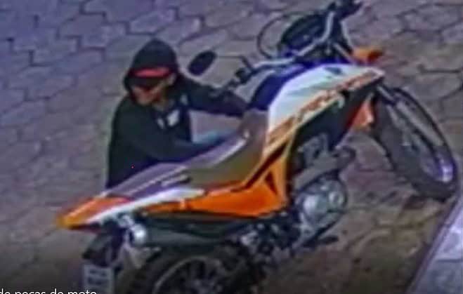 Câmeras de segurança registram o momento em que um sujeito rouba peças de uma moto esportiva que estava estacionada na Avenida 09 de fevereiro, altura do Comercial Igo importações.