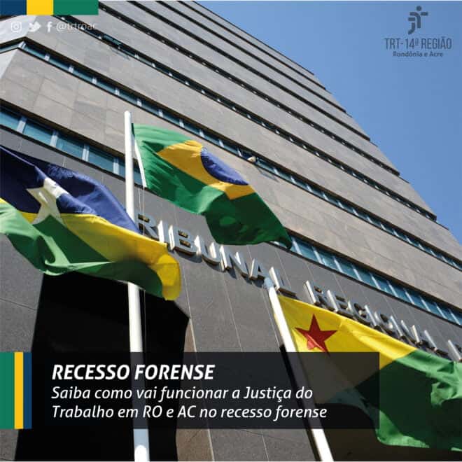 O chamado recesso forense, previsto no Código de Processo Civil, começará mais cedo na jurisdição do Tribunal Regional do Trabalho da 14ª Região, já que o feriado alusivo ao Dia da Justiça, celebrado no último dia 8, foi transferido para esta sexta-feira (17), conforme Portaria GP nº 1190, de 19 de novembro de 2021, da Presidência do Regional.