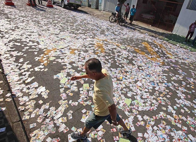 POLITICA 5563 07-10-2012 SAO BERNARDO DO CAMPO - SP / NACIONAL OE / ELEICOES 2012 / SUJEIRA SANTINHOS - Ruas cobertas por santinhos de candidatos no entorno da Escola Estadual Dr. João Firmino Correia de Araujo em Sao Bernardo do Campo, Grande Sao Paulo - FOTO DANIEL TEIXEIRA/AE