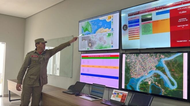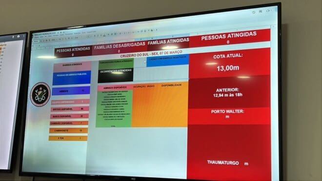 De acordo com o comandante do Corpo de Bombeiros do Juruá, Josadac Cavalcante, a nova estrutura de monitoramento foi montada dentro da corporação, em parceria com a Defesa Civil Municipal. “Criamos esta sala de situação para que as equipes possam acompanhar em tempo real os dados meteorológicos, os registros das réguas dos municípios e a quantidade de precipitação. O cruzamento dessas informações nos permite prever o nível do rio e estimar quantas famílias poderão ser atingidas”, explicou.