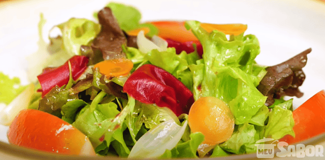 O tomate pode ser substituído por tomate cereja este cortado apenas ao meio.