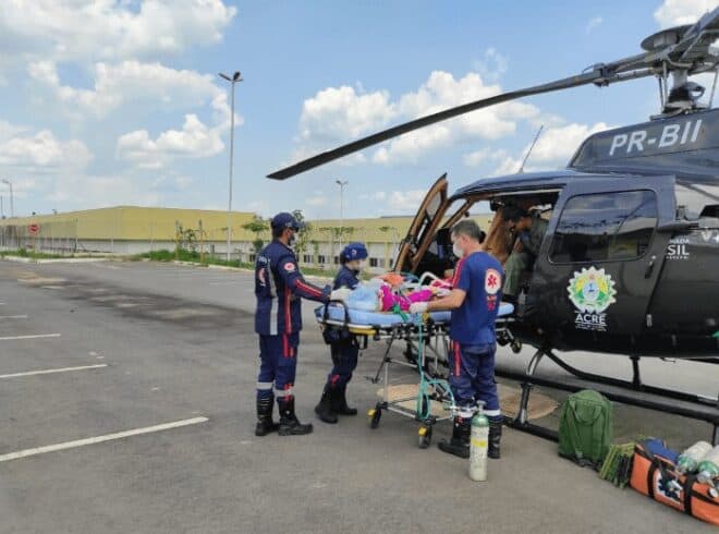 A paciente foi estabilizada e a seguir transladada pelo helicóptero Harpia 04, sob os cuidados das equipes do Ciopaer e Samu. Após 45 minutos de voo, foi encaminhada para a Unidade de Terapia Intensiva (UTI) do Pronto-Socorro de Rio Branco.