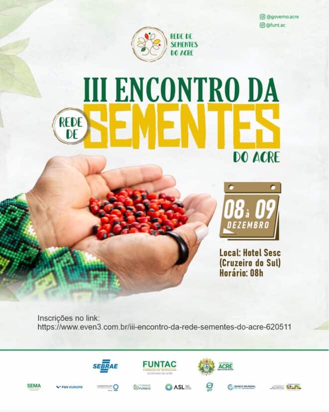 Nos dias 8 e 9 de dezembro, o Sebrae e a Funtac realizam o 3º Encontro da Rede de Sementes do Acre, em Cruzeiro do Sul. O evento objetiva a promoção do conhecimento, inovações, tecnologias e mercado, voltados para a bioeconomia de sementes florestais no Acre.