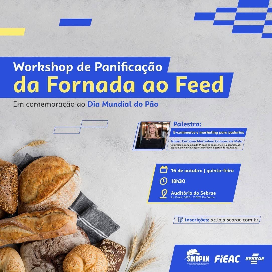 Nesta quinta-feira (16), o Sebrae, a Fieac e o Sindicato das Indústrias de Panificação e Confeitaria do Acre (Sindpan) realizam o “Workshop de Panificação: Da Fornada ao Feed”. O evento é gratuito e acontecerá na sede do Sebrae, em Rio Branco, a partir das 18h30.