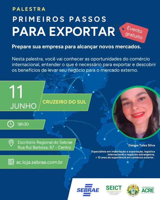 O Sebrae inicia as atividades do Projeto de Internacionalização de Empresas da região do Juruá com uma palestra gratuita voltada a empresários locais. O evento acontece no dia 11 de junho, das 18h30 às 20h30, no Escritório Regional do Sebrae em Cruzeiro do Sul (Rua Rui Barbosa, 67, Centro).