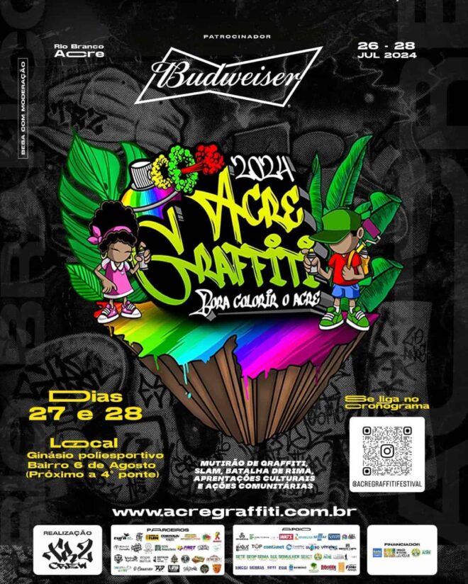 De 25 a 28 de julho, no Ginásio Poliesportivo do bairro Seis de Agosto, em Rio Branco, acontece o Acre Graffiti – 3° Festival Internacional de Culturas Urbanas. Com participação de aproximadamente 150 artistas, o evento irá reunir grafiteiros, poetas, dançarinos, artistas, músicos e o público geral de todo o país.