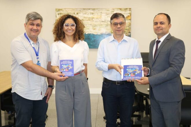 Na ocasião, o superintendente, acompanhado do gerente de Desenvolvimento do Ambiente de Negócios, Marcelo Macedo, apresentou a cartilha “Eleições 2024: Candidato parceiro do pequeno negócio”, com foco em fortalecer parceria com o TRE para disseminação do material. Também participaram do encontro o Desembargador Roberto Barros, e a diretora-geral do TRE, Rosana Magalhães.