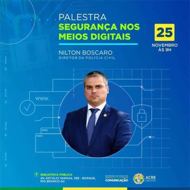 A Secretaria de Comunicação do Acre (Secom) oferecerá na sexta-feira, 25, na Biblioteca Pública, em Rio Branco, a palestra Segurança nos Meios Digitais, ministrada pelo diretor da Polícia Civil, Nilton Boscaro.