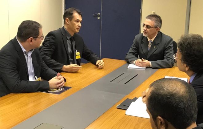 O secretário de Estado de Justiça e Segurança Pública (Sejusp), coronel Paulo Cézar Santos, acompanhado pelo diretor Técnico da Polícia Civil do Acre, Alex Cavalcante, se reuniu nessa segunda-feira, 18, em Brasília, com o secretário Nacional Adjunto de Segurança Pública (Senasp), Brigadeiro Fernando Almeida Riomar, e o diretor de Ensino e Estatística, Jorge Pontes.