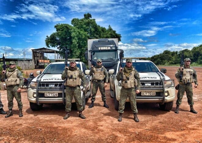 Por volta das 15h deste sábado, 25, estacionava, no Batalhão de Operações Policiais Especiais (Bope), em Rio Branco, o caminhão, tipo baú,da Força Nacional, escoltado por duas guarnições do Grupo Especial de Fronteiras (Gefron), sob o comando do tenente PMAC Passos, carregado de armas, munições e diversos outros equipamentos, adquiridos por meio de convênios com o Ministério da Justiça e Segurança (MJS) e doação da Polícia Militar do Distrito Federal, que chegam para potencializar a prevenção e a repressão da criminalidade no âmbito do estado do Acre.