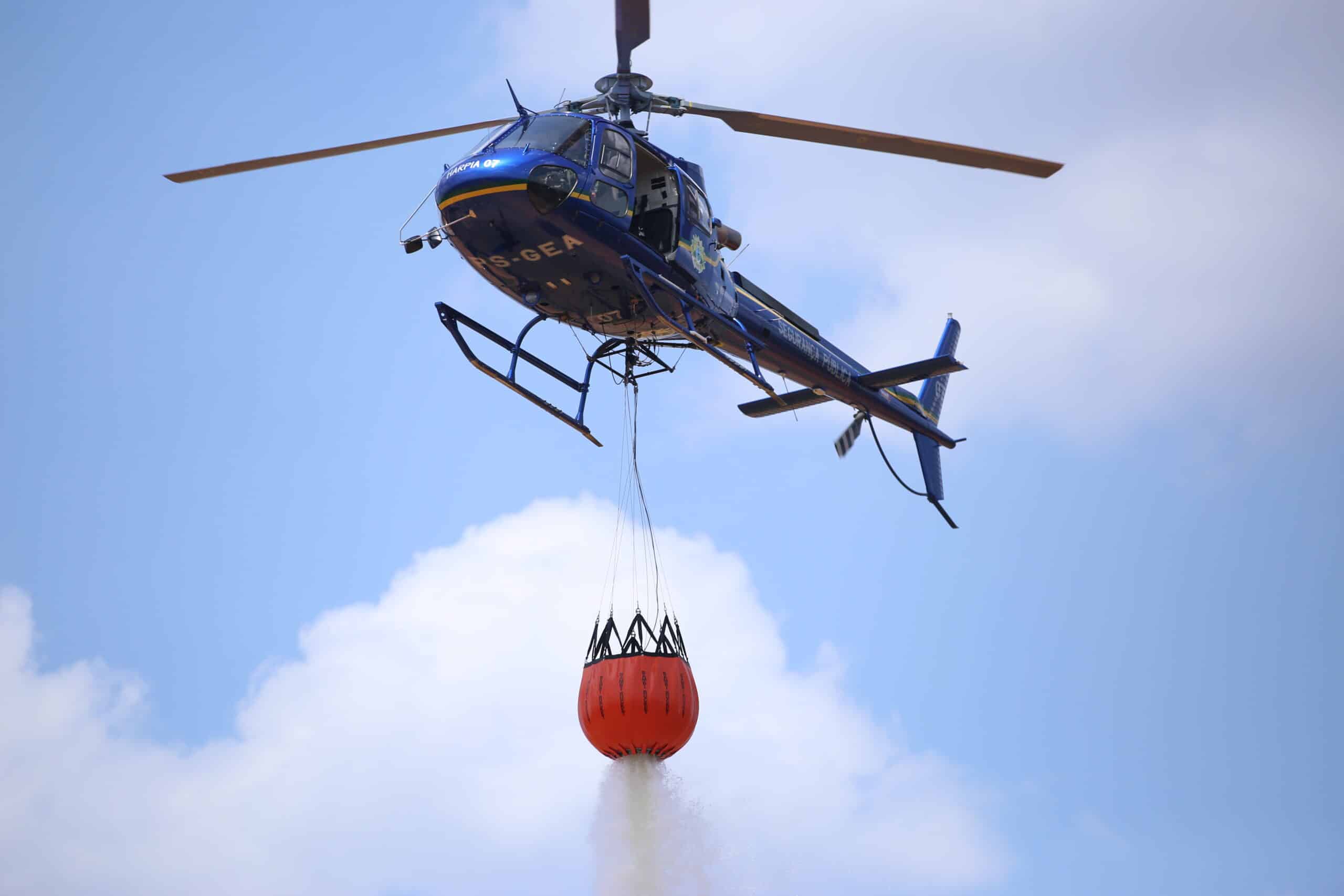 Fixado a um cabo sob o helicóptero, o Bambi Bucket é um equipamento utilizado em operações de combate a incêndios florestais, que consiste em um grande balde flexível que pode ser carregado por helicópteros para transportar e lançar grandes quantidades de água diretamente sobre áreas em chamas.
