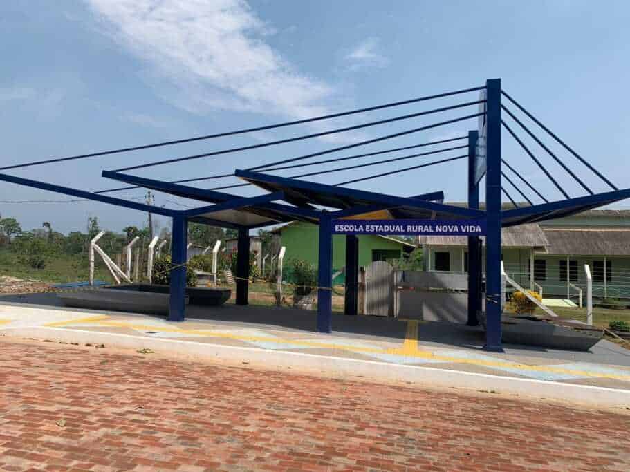 Na verdade, essa estrutura está sendo montada em todas as escolas rurais e serve como um portal da fachada das escolas. Sua função é dar uma estrutura segura para os alunos que utilizam o transporte escolar. Não se trata apenas da estrutura aparente. Foi realizado um trabalho de implantação de calçamento com tijolos, com base sub-base, por 300 metros na entrada da escola para evitar que a poeira atinja as salas de aula e o desembarque dos alunos no tempo do verão ou que a lama prejudique o acesso à unidade escolar no inverno. É um forte apoio para os estudantes que chegam ou saem da escola, que aumenta a segurança do embarque e desembarque.