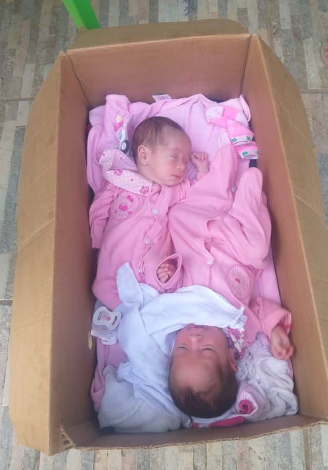 Gêmeas ficam dentro de uma caixa de papelão enquanto mãe trabalha — Foto: Cely Gomes/Arquivo pessoal