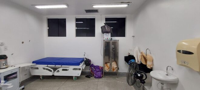 O forro de gesso da semi-intensiva também apresenta falhas que causam receio de acidentes na equipe que trabalha no local. O mesmo ambiente possui um espaço improvisado para o repouso de médicos, enquanto a sala de higienização também se transforma em uma copa.