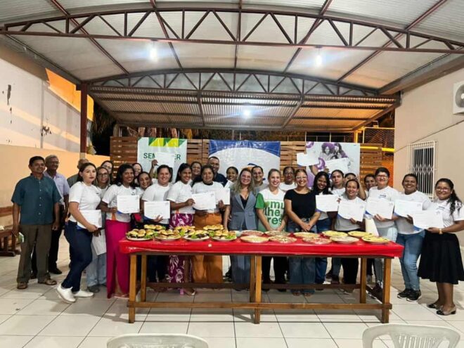 Ainda na sexta-feira, 26, a equipe da Semulher esteve em Sena Madureira para certificar 30 mulheres que concluíram o curso de Preparo de Pizza e Hambúrguer, disponibilizado por meio do programa Impacta Mulher. O evento, realizado na Primeira Igreja Batista Regular, contou, além da participação das formandas, com a presença da diretora de Políticas Públicas da Semulher, Joelda Pais; da chefe do Departamento de Promoção da Autonomia Econômica das Mulheres da Semulher, Paloma Sales; e da coordenadora do Senac Bosque, Carlete Oliveira.