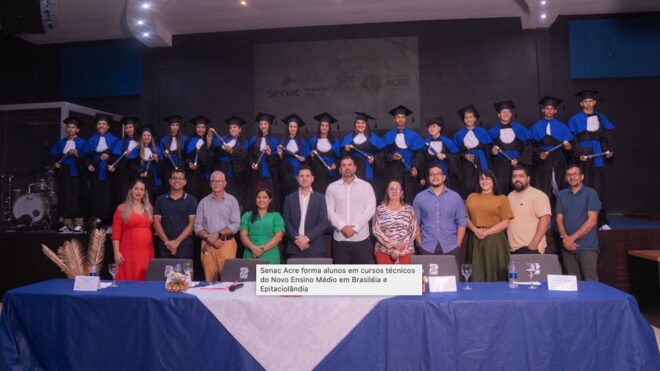 Na noite desta quinta-feira, 27, o Senac Acre realizou a cerimônia de formatura de 124 alunos dos cursos técnicos ofertados por meio do Novo Ensino Médio nos municípios de Brasiléia e Epitaciolândia. O evento, realizado na Igreja da Paz (Templo Central de Brasiléia), reuniu autoridades locais, gestores educacionais, familiares e convidados para celebrar a conquista dos formandos, que concluíram cursos técnicos em Administração, Recursos Humanos, Redes de Computadores e Informática.
