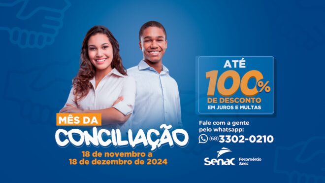 O Senac Acre, com o objetivo de oferecer aos alunos e ex-alunos oportunidades especiais de regularização de débitos em atraso, realiza, de 18 de novembro a 18 de dezembro, o segundo Mês da Conciliação Senac 2024. A iniciativa abrange as unidades de Rio Branco, Cruzeiro do Sul, Feijó e Brasiléia, e contará também com atendimento por telefone e WhatsApp.