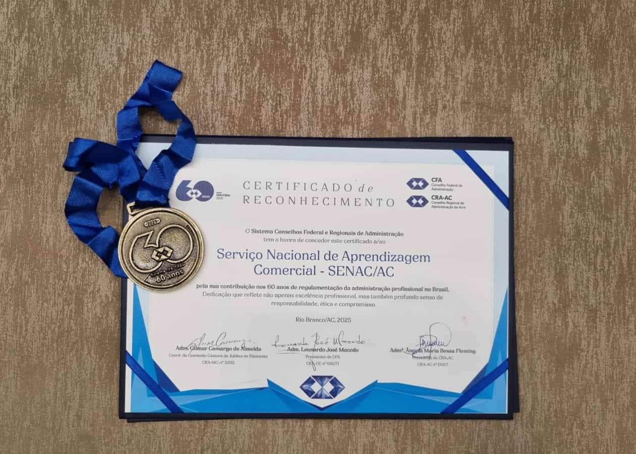 O Senac Acre foi agraciado com a Medalha do Mérito do Jubileu de Diamante da Administração, em reconhecimento ao relevante papel desempenhado na formação profissional e na promoção da educação voltada para o setor do comércio e de serviços no estado. A honraria foi entregue durante solenidade realizada no AFA Jardim, na quarta-feira, 1º, em Rio Branco, que reuniu autoridades e representantes do sistema CFA/CRAs.