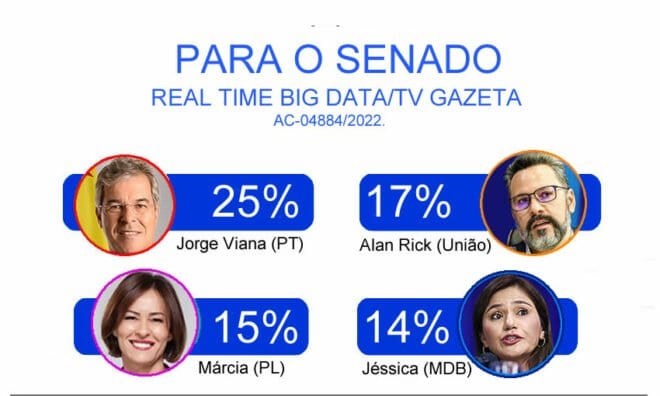 O Instituto Real Time Big Data, contratado pela TV Gazeta/Rede Record, também divulgou os números das intenções de votos para a única vaga do Acre disputada neste ano para o senado federal. De acordo com o levantamento estimulado, o ex-senador Jorge Viana (PT) aparece na frente com 24%, seguido pelo deputado federal Alan Rick (União Brasil) com 17%. Márcia Bittar (PL) aparece com 15% e a deputada federal Jéssica Sales (MDB) surge com 14%. A atual senadora Mailza Gomes (Progressistas) marca 5% contra 3% da deputada federal Vanda Milani (PROS). Sanderson Moura (PSOL) registrou apenas 1%. Branco e nulo 12% e não sabem ou não responderam 9%.