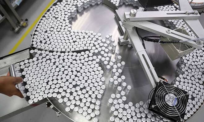 An employee puts on an equipment vials containing CoronaVac, Sinovac's vaccine against the coronavirus disease (COVID-19), at Butantan biomedical production center in Sao Paulo, Brazil January 22, 2021. REUTERS/Amanda Perobelli