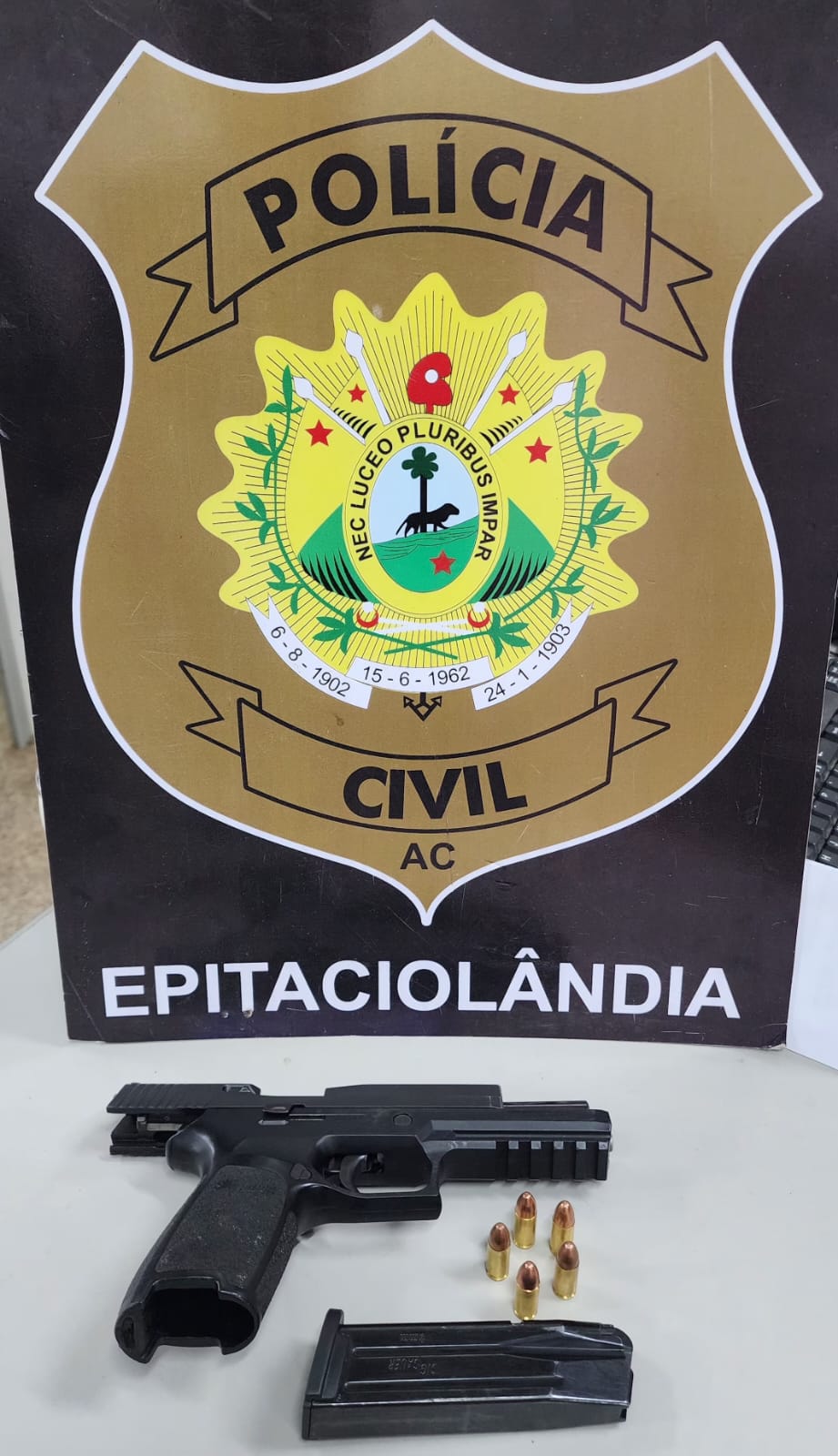 A Polícia Civil, por meio da equipe de investigação da Delegacia Geral de Epitaciolândia, apreendeu na manhã desta quinta-feira (18) uma pistola calibre 9mm furtada em território boliviano. Segundo as autoridades, a arma pertence à Polícia Nacional da Bolívia e havia sido subtraída na cidade de Cobija, sendo posteriormente levada para o Brasil.