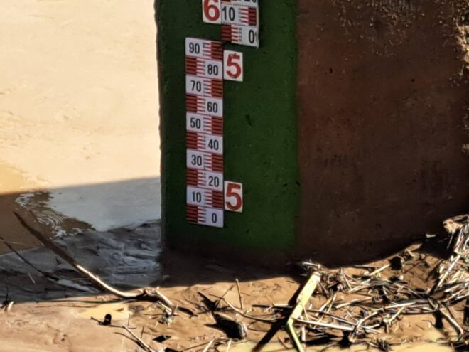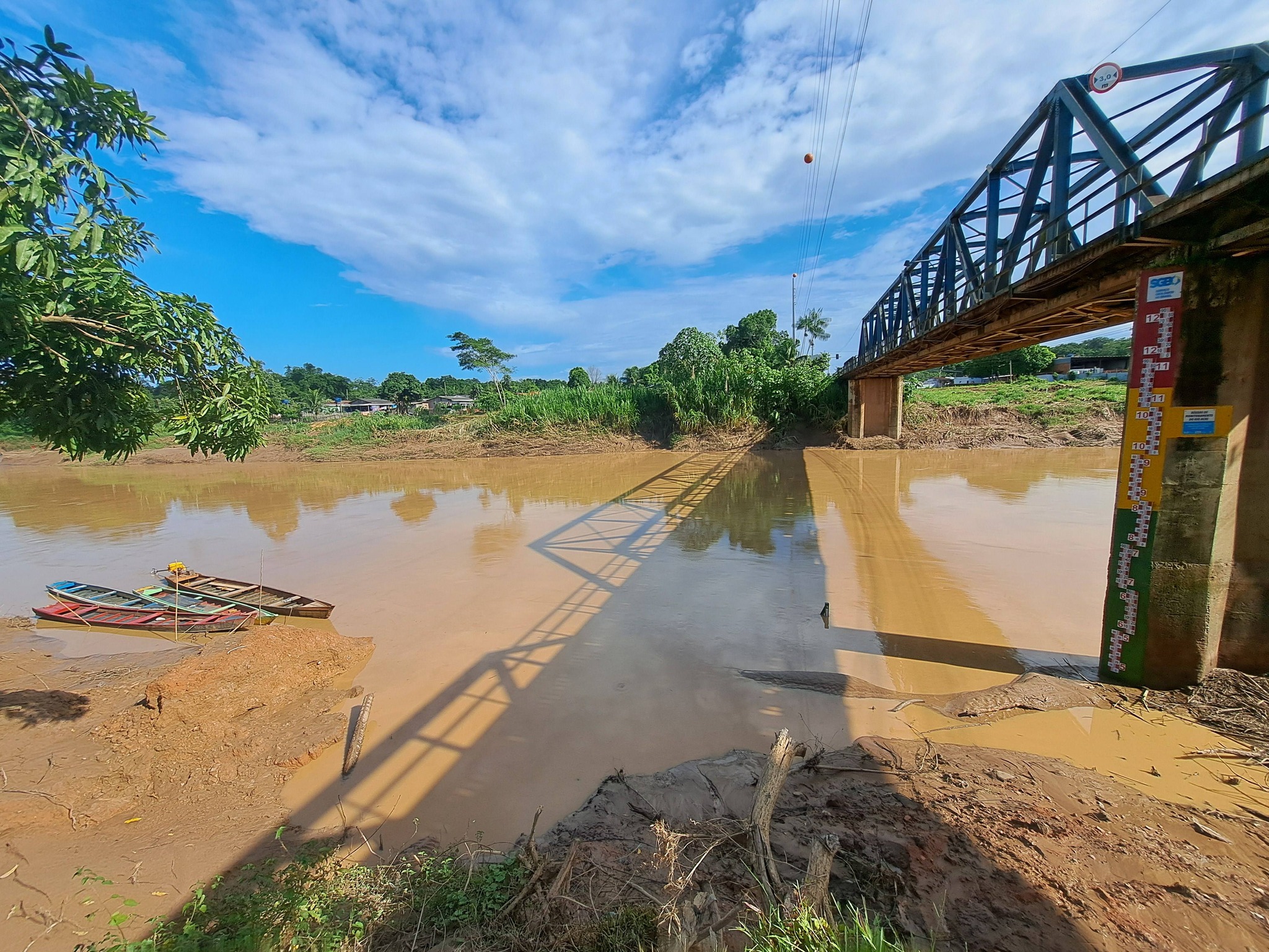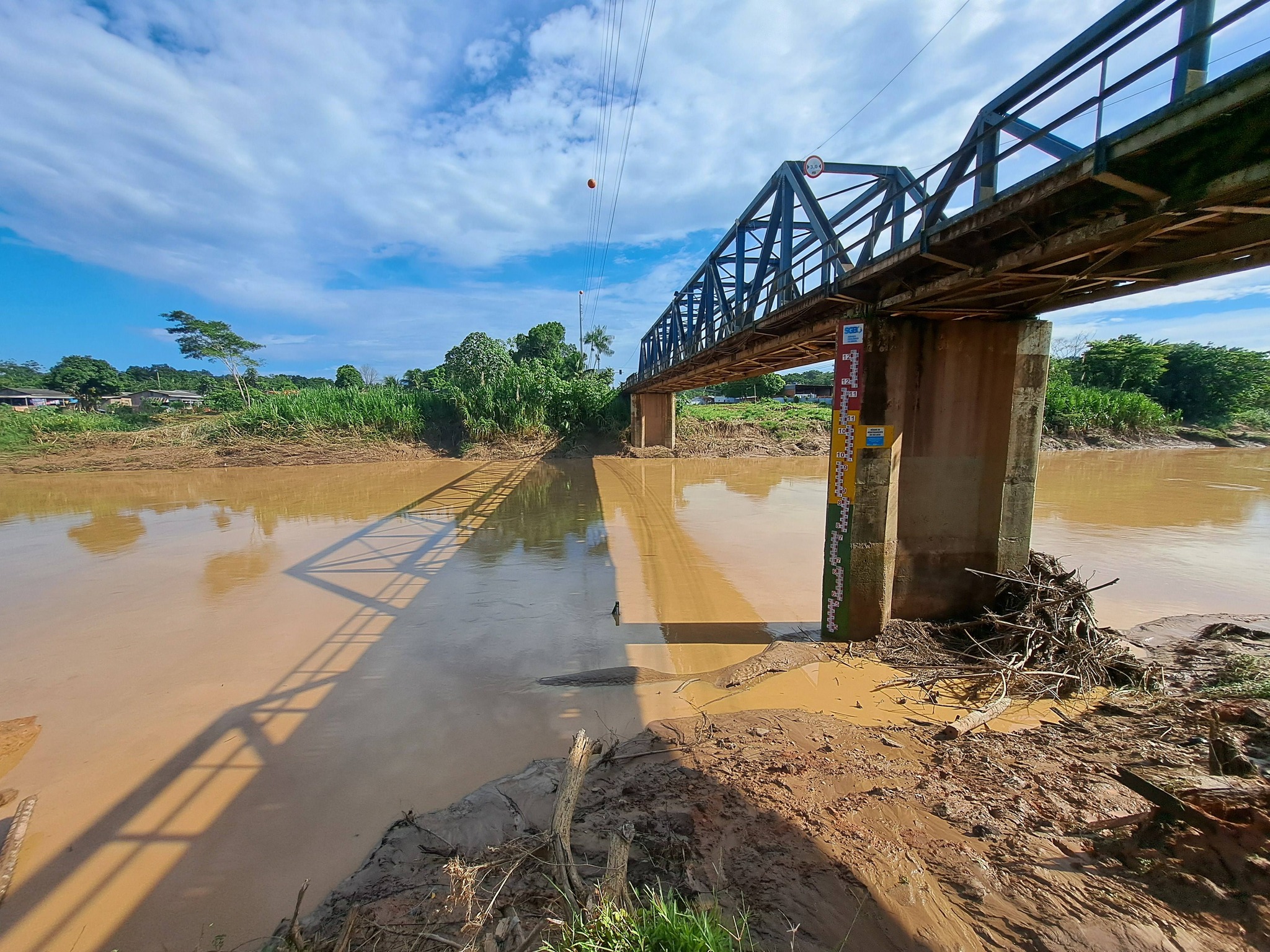 Em Assis Brasil, as medições já indicam redução acentuada, com o nível marcando 4,60 m, confirmando que o volume que passou por Brasiléia segue em direção a Rio Branco. A Defesa Civil segue monitorando. Foto: Marcus José