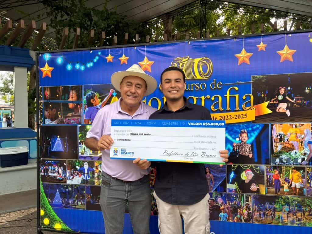 O repórter fotográfico e videomaker da Secretaria de Estado de Comunicação (Secom), Samuel Moura, conquistou o 1º lugar na 5º edição do concurso de fotografias natalinas realizado pela Prefeitura Municipal de Rio Branco. A premiação aconteceu nesta sexta-feira, 30, na Praça da Revolução, e contou com a presença do prefeito da capital acreana, Tião Bocalom. O profissional recebeu a quantia de R$ 5 mil como prêmio.