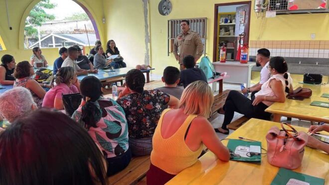 Um grupo de servidores da Secretaria Municipal de Educação (Seme) participou na sexta-feira, (12), de um treinamento com profissionais do Corpo de Bombeiros com foco em evacuação, uso de preventivos móveis e primeiros socorros no ambiente de trabalho.