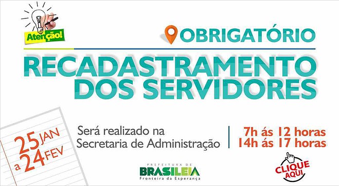 A prefeitura de Brasiléia através da Secretaria de Administração começou na quarta-feira, dia 25 de janeiro o Recadastramento dos Servidores, o prazo final será no dia 25 de fevereiro. O recadastramento é obrigatório para todos os servidores, empregados públicos ou inativos.