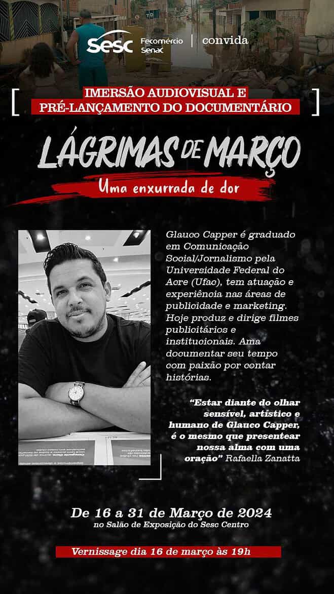 O Serviço Social do Comércio (Sesc no Acre) apresenta a imersão audiovisual e o pré-lançamento do documentário “Lágrimas de Março – uma enxurrada de dor”, dirigido pelo jornalista e filmmaker Glauco Capper. A exposição ocorre de 16 a 31 de março, no Salão de Exposição do Sesc Centro, já a vernissage acontece no dia 16 de março, às 19 horas.