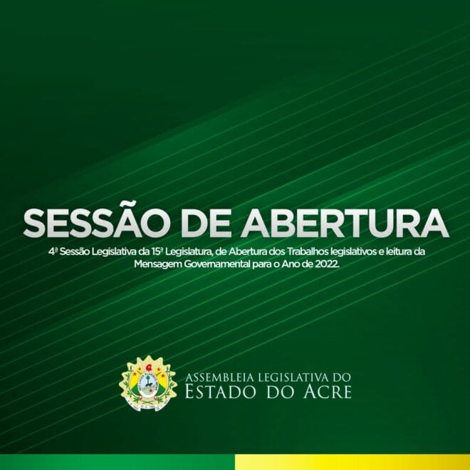 A assessoria de imprensa da Assembleia Legislativa do Acre (Aleac) informa que está convocada a Sessão Solene de Abertura dos Trabalhos do Parlamento acreano para o ano de 2022, nesta terça-feira (1°), às 10h. Em razão do aumento dos casos da Covid-19 e de gripe nos municípios acreanos, a solenidade será realizada de modo remoto, transmitida pela plataforma digital da Aleac através do YouTube e Facebook. Na ocasião, o governador do Estado, Gladson Cameli, ou seu representante, fará a leitura da mensagem governamental.