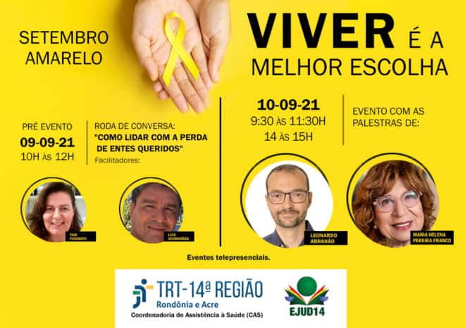 Já no dia 10, data em que se celebra o Dia Mundial de Prevenção ao Suicídio, a partir das 9h30 (horário de RO) e 8h30 (horário do AC), acontece o evento principal com as palestras dos psicólogos Leonardo Abrahão e Maria Helena Pereira Franco, falando sobre prevenção, luto e promoção de saúde mental.