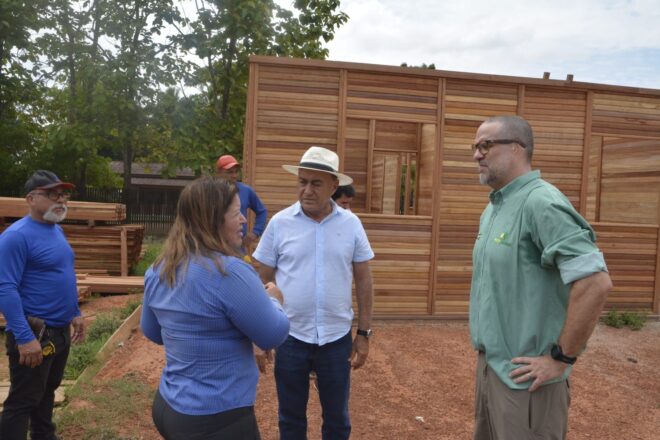 O prefeito Tião Bocalom, que acompanhou os empresários em uma visita à serraria municipal, onde os painéis e plataformas das casas estão sendo montados, relembrou como o projeto “1001 Dignidades” teve início. “O projeto nasceu no pátio da Agrocortex, quando percebi o potencial da madeira que estava disponível e decidimos utilizá-la para construir casas populares”, contou.