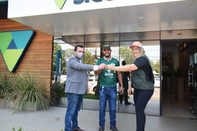 Para fazer a entrega do veículo estiveram presentes o diretor de controles e risco do Sicoob Acre Brasiléia, Mayko Sales Barroso, e a gerente de negócios, Silvana Lira.