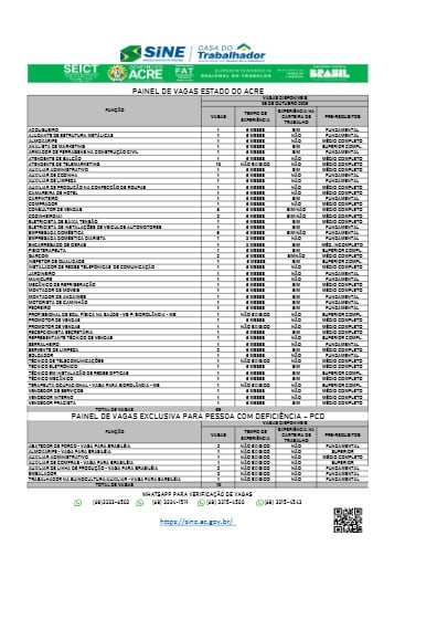 Os interessados podem obter mais informações e consultar os critérios de cada vaga diretamente no Sine Acre, localizado em Rio Branco, ou pelos telefones (68) 3223-6502, (68) 3224-1519, (68) 3215-4500 e (68) 3215-4543.