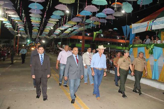 Prefeito de Brasiléia, Everaldo Gomes e seu vice, Jorge da Fazenda, juntamente com secretários, vereadores e convidados, receberam o gestor de Epitaciolândia, André Hassem e representantes do Exercito Brasileiro no palanque oficial para comemorar os 103 anos de fundação do Município.
