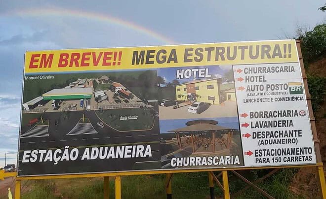 Uma placa informativa posicionada para os dois sentidos da rodovia federal anuncia que ali haverá em breve um empreendimento ousado e inovador no estado do Acre: Uma estação aduaneira onde se instalarão órgãos como o Dnit e a Suframa, entre outros, e que terá uma superestrutura de serviços a ser oferecida a viajantes, caminhoneiros e turistas.