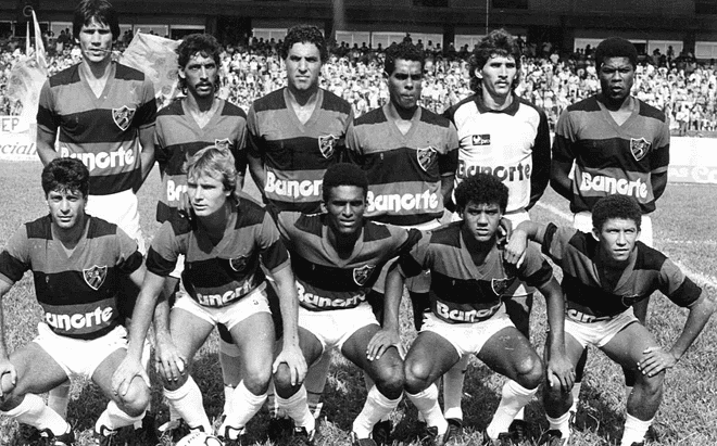 Jogadores do Sport em pé (da esquerda para a direita): Marco Antônio, Roberto, Rogério, Estavam, Betão, o goleiro Flávio e Macaé. Agachados: Robertinho, Ribamar, Nando, Zico e Neco, antes da partida contra o Guarani, válida pelo Campeonato Brasileiro de 1987 (Foto: Acervo/Gazeta Press)