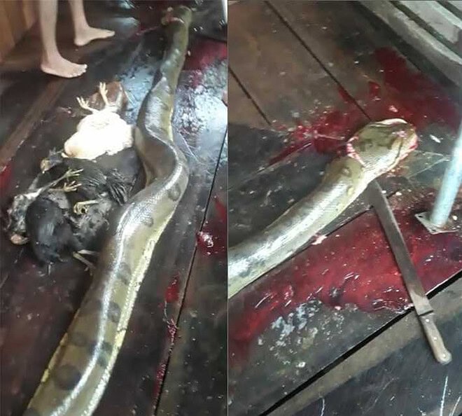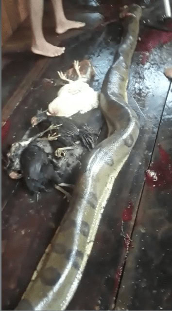 Nesse caso, após ver suas galinhas sendo comidas pela cobra em plena luz do dia, não pensou três vezes em pegar um terçado (facão) e matar a cobra dentro da área da casa.