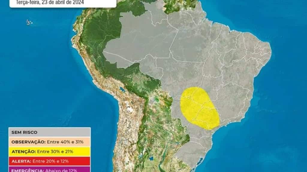 Nesta quarta-feira, os menores índices de umidade do ar devem ser registrados nas áreas indicadas em amarelo no mapa acima. Nelas, a situação é de atenção, já que os níveis de umidade devem ficar entre 21% e 30%.