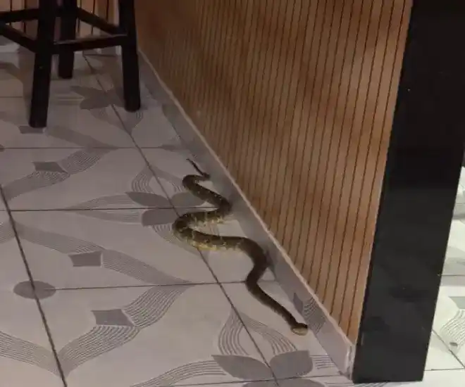 O Corpo de Bombeiros foi acionado e realizou o resgate da cobra com segurança. O animal deve ser solto em área não povoada.