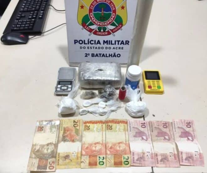 Durante o final de semana, a Polícia Militar apreendeu porções de maconha e cocaína, uma balança de precisão, materiais usados para embalar entorpecentes e uma maquininha de cartão em uma residência no Ramal da Garapeira, na rua Boa Esperança, Bairro Vila Acre, em Rio Branco.