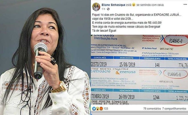 A indignação com os aumentos excessivos na conta de luz chegou ao primeiro escalação do Governo do Estado. A Secretária de Empreendedorismo e Turismo, Eliane Sinhasique, não perdoou a Energisa e postou em suas redes sociais a conta de luz que aumentou R$ 445 em agosto, mesmo tendo ela passado metade do mês fora de casa.