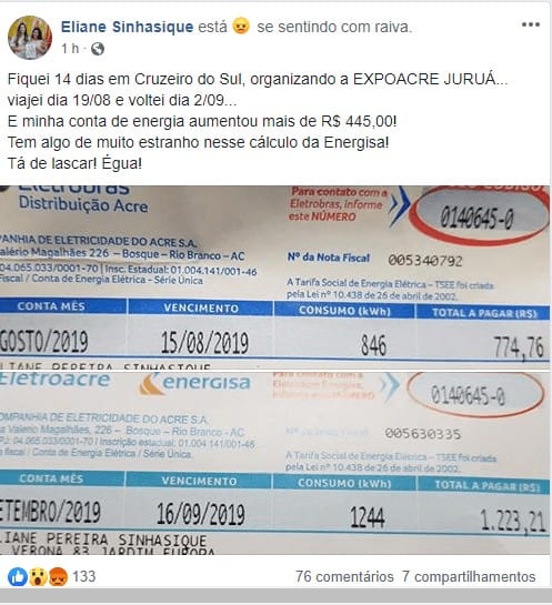 “Fiquei 14 dias em Cruzeiro do Sul, organizando a Expoacre Juruá… Viajei dia 19/08 e voltei dia 2/09.. E minha conta de energia aumentou mais de R$ 445,00!”, relatou em tom de protesto.