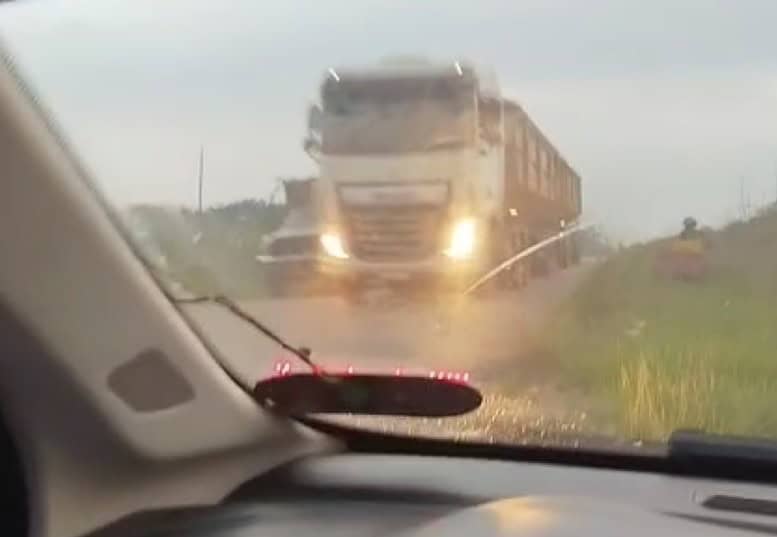 Um motociclista que vinha logo à frente também fez a mesma manobra, saindo parcialmente da pista. Até o momento, não há informações sobre a identificação do motorista da carreta.