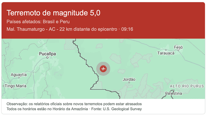 Um abalo sísmico de magnitude 5,1 atingiu Marechal Thaumaturgo, no interior do Acre, nesta manhã de quarta-feira (27). O terremoto foi detectado pelo Centro Sismológico Euro-Mediterrânico por volta das 9h16, a uma profundidade de 35 km.